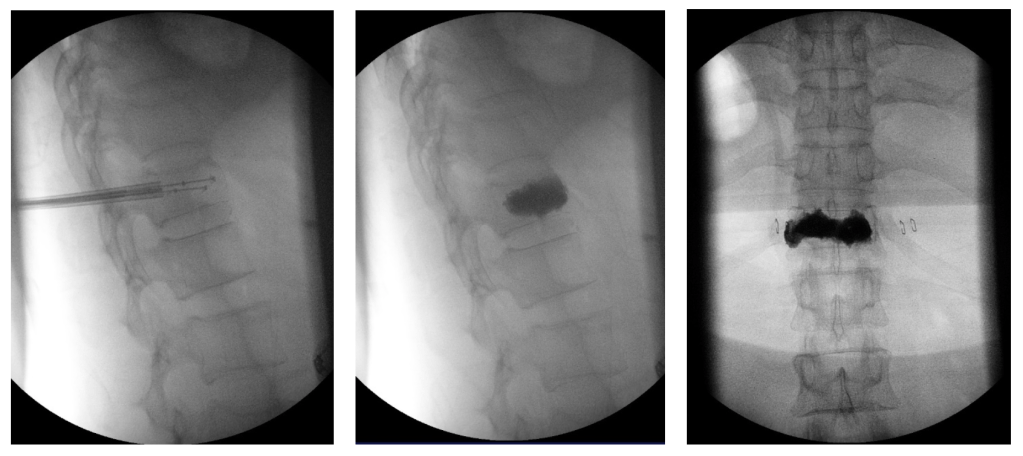 ภาพเอ๊กซเรย์จากจอมอนิเตอร์ในห้องผ่าตัด แสดงภาพขณะฉีดซีเมนต์ โดยการยกถ่างกระดูกสันหลังด้วยการใช้บอลลูน (Balloon Kyphoplasty)
