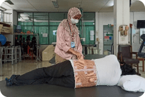 2. ผู้ป่วยพลิกตะแคงตัวไปด้านใดด้านหนึ่ง โดยพลิกให้ไหล่และสะโพกไปพร้อมกัน นำอุปกรณ์พยุงหลังออกจากตัวผู้ป่วย