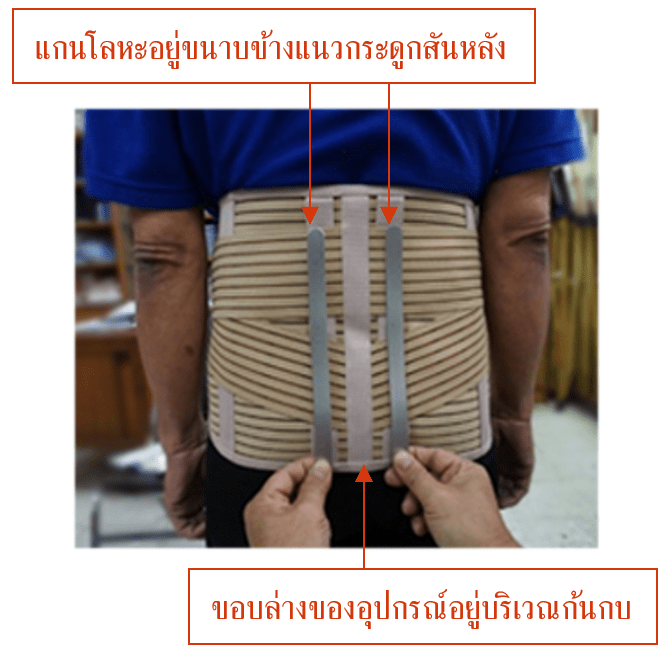 2. นำอุปกรณ์พยุงหลังเข้าไปวางด้านหลังลำตัวผู้ป่วยโดยให้ขอบล่างของอุปกรณ์อยู่บริเวณก้นกบ และแนวแกนโลหะอยู่ขนาบข้างแนวกระดูกสันหลัง และสอดปลายอุปกรณ์ไว้ข้างลำตัว