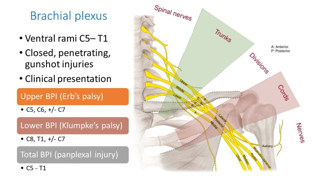 brachial plexus คือโครงข่ายของเส้นประสาท ที่มีจุดกำเนิดมาจากไขสันหลังบริเวณคอ ข้อที่ 5 จนถึงไขสันหลังส่วนอกข้อที่ 1 (C5-T1)
