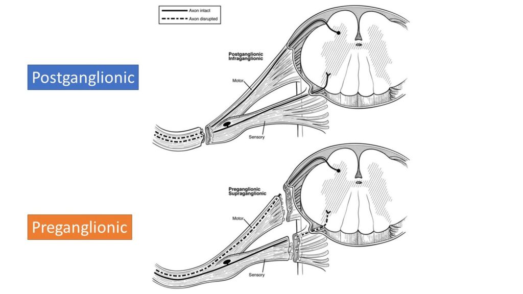 ในบางราย เส้นประสาทได้รับบาดเจ็บตั้งแต่ส่วนตอของเส้นประสาทที่แยกออกจากไขสันหลัง