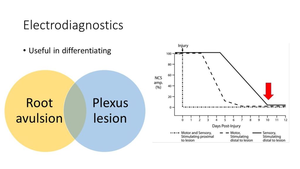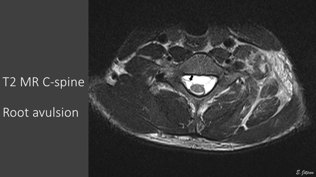 - ในผู้ป่วยบางรายพบมีเส้นประสาทขาดออกจากไขสันหลัง (avulsion injury) ในผู้ป่วยกลุ่มดังกล่าว มักเกิดจากการบาดเจ็บที่รุนแรง และมักจะไม่หายเอง จึงมักทำการผ่าตัดค่อนข้างเร็วในผู้ป่วยกลุ่มนี้ โดยทั่วไปมักผ่าตัดในระยะเวลา 2-6 เดือน