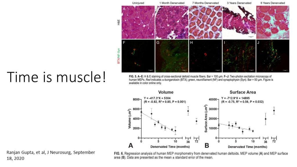 ระยะเวลาที่กล้ามเนื้อจะกลับมาทำงานหลังการผ่าตัด จึงขึ้นอยู่กับระยะทางระหว่างเส้นประสาทที่บาดเจ็บกับกล้ามเนื้อ