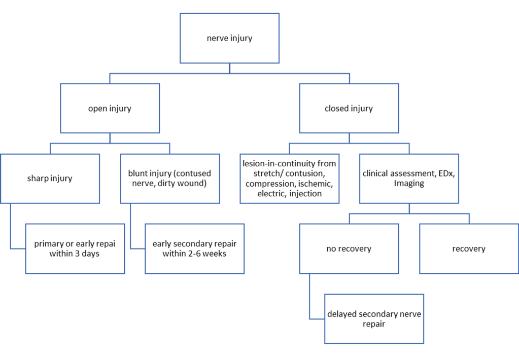 การรักษาผู้ป่วยที่มีโครงข่ายเส้นประสาทบาดเจ็บ ต้องพิจารณาจากหลายปัจจัยร่วมกัน ทั้งสาเหตุของการบาดเจ็บ ระดับของการบาดเจ็บ และความรุนแรงของการบาดเจ็บ