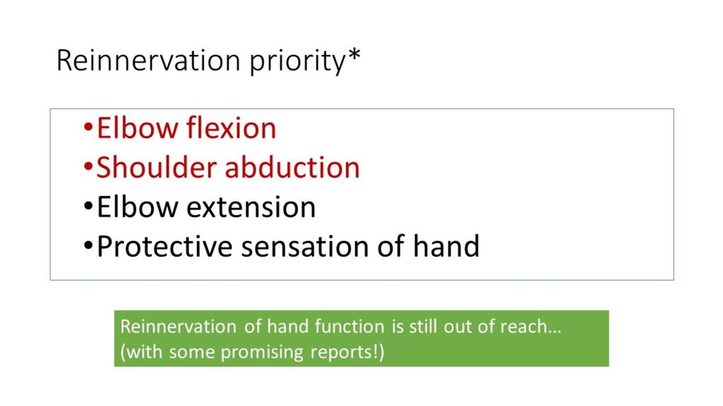 โดยทั่วไปแล้ว การทำงานที่เราต้องการฟื้นฟูมากที่สุด คือ ความสามารถในการงอศอก ตามมาด้วยความสามารถในการอ้าไหล่ และยกไหล่
