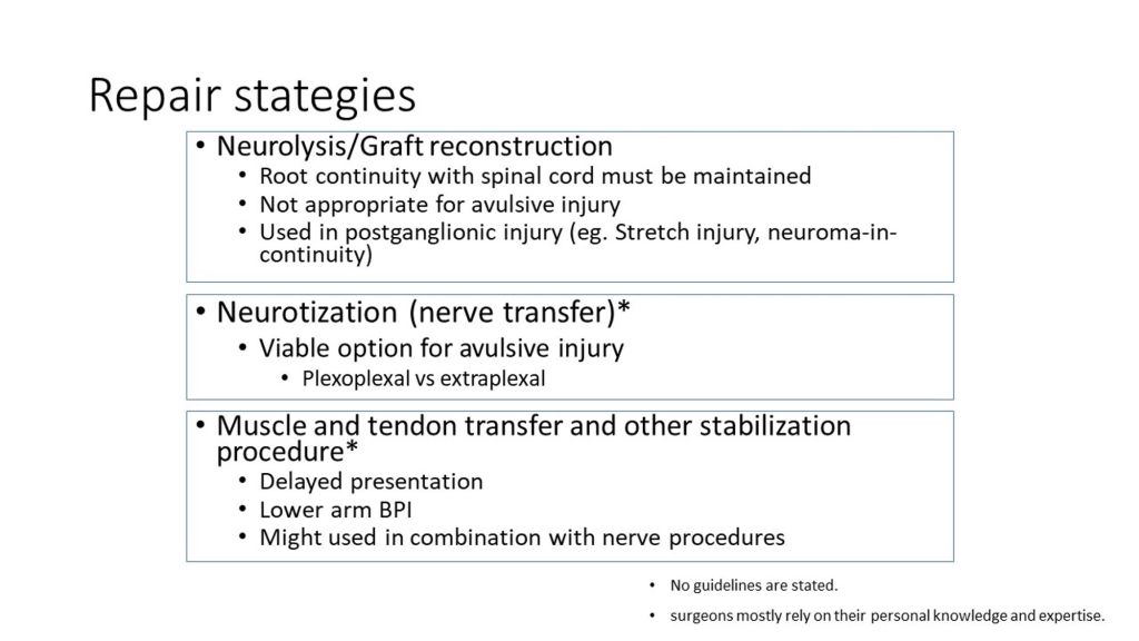 การเลือกวิธีการผ่าตัด ถือเป็นดุลยพินิจของศัลยแพทย์เส้นประสาท เนื่องจากผู้ป่วยแต่ละราย มีตำแหน่งของการบาดเจ็บ ระดับของความบาดเจ็บ และเส้นประสาทที่นำมาใช้ได้ไม่เหมือนกัน ไม่ได้มีวิธีการผ่าตัดใดที่ถือเป็นมาตรฐานชัดเจน ดังนั้นผู้ป่วยแต่ละราย จึงมีวิธีการผ่าตัดที่แตกต่างกัน