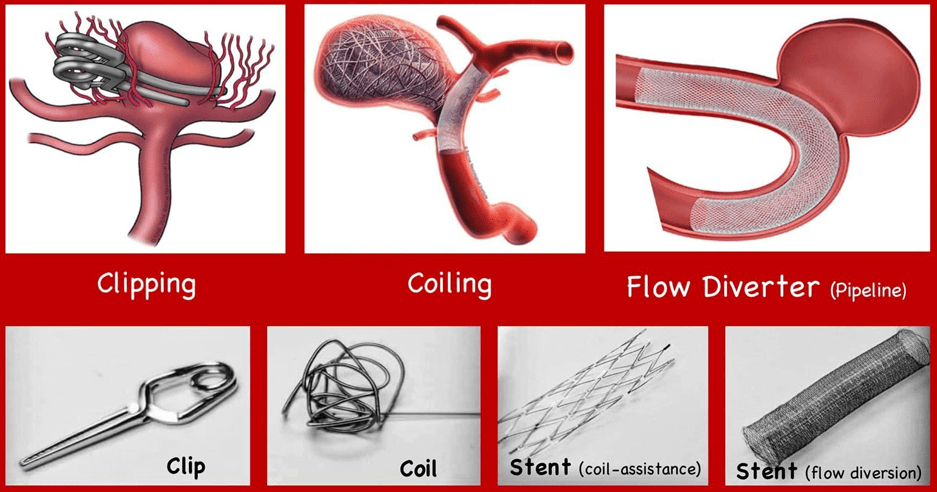 - Endovascular treatment ซึ่งประกอบด้วย coiling, stent-assisted coil หรือ flow diversion with stent เป็นการอุดบริเวณหลอดเลือดที่โป่ง เพื่อลดโอกาสแตกซ้ำ เป็นการรักษาผ่านการสอดท่อและอุปกรณ์เข้าทางหลอดเลือดที่ขาหนีบหรือข้อมือ วิธีนี้ไม่ต้องผ่าตัดเปิดกะโหลกทำให้มีการฟื้นตัวที่เร็วกว่า แต่มีความเสี่ยงในการเกิดหลอดเลือดแตกเพิ่ม มีโอกาสแตกซ้ำหรือเป็นซ้ำได้มากกว่า และมักจะทำไม่ได้ในผู้ป่วยที่อาการหนัก ผู้ปวยที่ความดันในกะโหลกสูงหรือมีเลือดออกในเนื้อสมองร่วมด้วย รวมถึงรายที่มีลักษณะหลอดเลือดซับซ้อนมาก